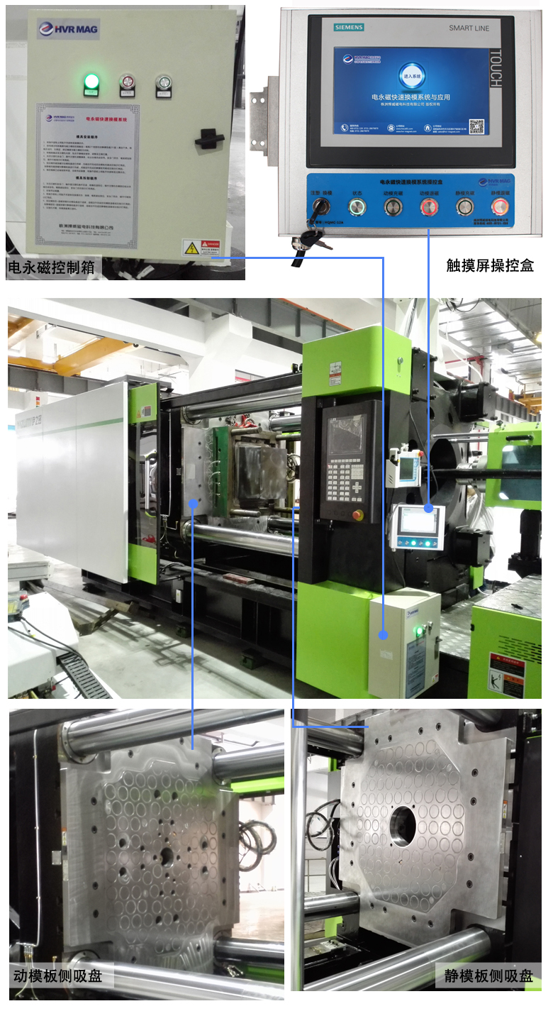 改善后:換模時間縮短到1-3分鐘,磁力均勻分部于模具,與磁極面全面接觸,更好的保證了合模精度,提高質(zhì)量,減少耗損,模具使用壽命提高50%以上。