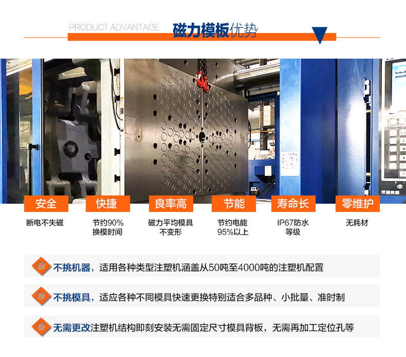 立式注塑機(jī)是目前中國(guó)發(fā)展最快的塑料機(jī)械之一,與工業(yè)發(fā)達(dá)國(guó)家的距離很近。 越來(lái)越多的制造業(yè)開(kāi)始用磁性模板代替手動(dòng)更換模具。 悍威磁電開(kāi)發(fā)生產(chǎn)的磁性模板與立式注塑機(jī)的配套使用,增強(qiáng)了公司的核心競(jìng)爭(zhēng)力。